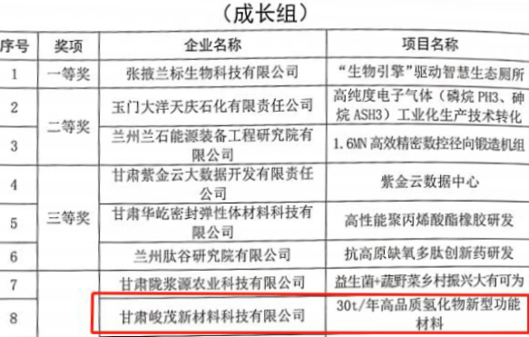 近日,從第十一屆中國(guó)創(chuàng)新創(chuàng)業(yè)大賽(甘肅賽區(qū))組委會(huì)獲悉,蘭州新區(qū)專(zhuān)精特新化工產(chǎn)業(yè)孵化基地的兩家入駐企業(yè)——甘肅峻茂新材料科技有限公司和蘭州昱重醫(yī)藥科技有限公司分別榮獲第十一屆中國(guó)創(chuàng)新創(chuàng)業(yè)大賽(甘肅賽區(qū))優(yōu)秀企業(yè)獎(jiǎng)。