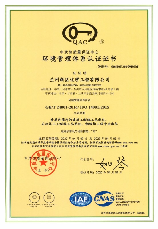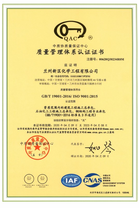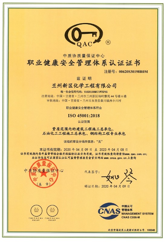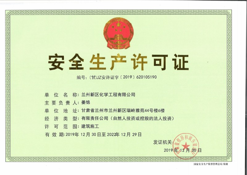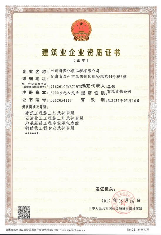 蘭州新區(qū)化學(xué)工程有限公司目前已取得了石油化工總承包三級、建筑工程總承包三級、鋼結(jié)構(gòu)專業(yè)承包三級、地基處理專項(xiàng)承包三級資質(zhì)。