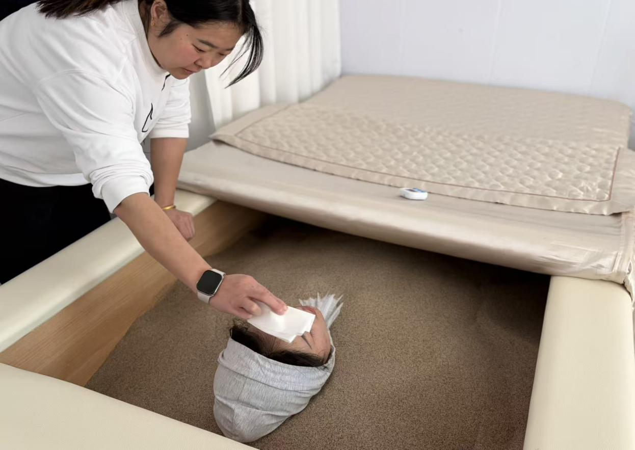 下午,活動迎來重頭戲——沙療主題養(yǎng)生體驗。全體女職工前往專業(yè)沙療養(yǎng)生館,沉浸式感受源自維吾爾的沙療文化。沙療,又稱埋沙療法,是依托西北獨特地理氣候條件形成的傳統(tǒng)養(yǎng)生技藝,通過溫?zé)岬奶烊坏V沙覆蓋身體,利用沙粒的機械壓力與遠(yuǎn)紅外效應(yīng),深層驅(qū)散體內(nèi)濕寒,舒緩肌肉疲勞,改善血液循環(huán)。