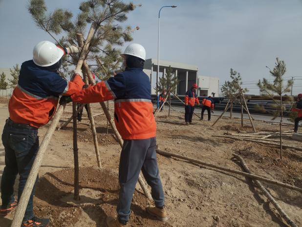 活動中,廠區(qū)內(nèi)部到處都是緊張有序的勞動景象,參加植樹的干部職工個個配合默契、干勁十足,有的拿鐵鍬,有的運(yùn)樹苗,你追我趕,比干勁、比進(jìn)度,各個環(huán)節(jié)銜接有序?;顒蝇F(xiàn)場共栽植棗樹、杏樹、松樹等600余棵。