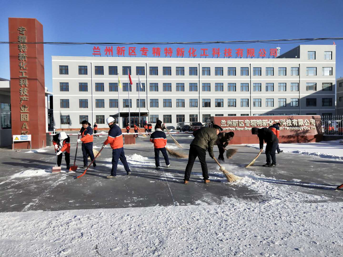 雖然早上的西小川氣溫在零下20多度,但大家不畏嚴(yán)寒,工作熱情絲毫不減,鏟的鏟、掃的掃、拉的拉,分工合作、配合默契,干的熱火朝天。經(jīng)過兩個(gè)多小時(shí)的奮戰(zhàn),公司院內(nèi)和大門口的積雪就被清掃的干干凈凈。