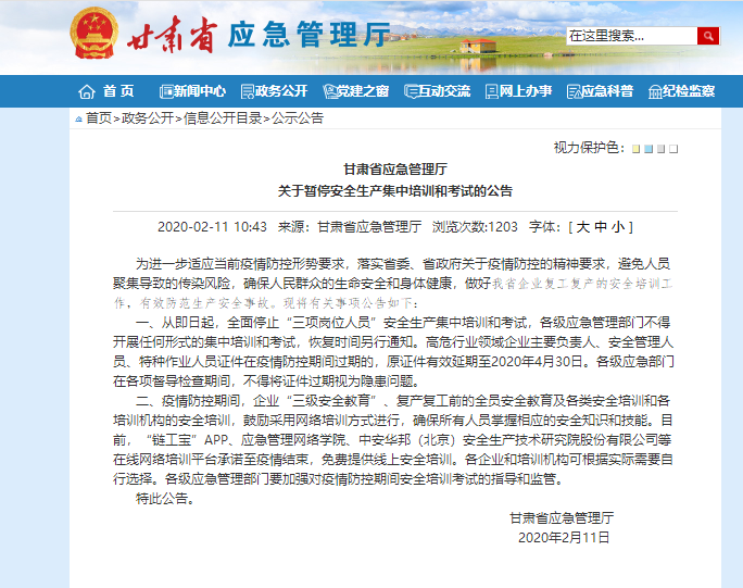 為全面落實疫情防控和安全培訓工作要求,蘭州新區(qū)化學工程有限公司培訓中心結(jié)合疫情防控和復(fù)產(chǎn)復(fù)工實際,根據(jù)甘肅省應(yīng)急管理廳2月11日發(fā)布的《關(guān)于暫停安全生產(chǎn)集中培訓和考試的公告》相關(guān)要求,在疫情期間免費為新區(qū)企業(yè)提供線上復(fù)工復(fù)產(chǎn)專題安全培訓。