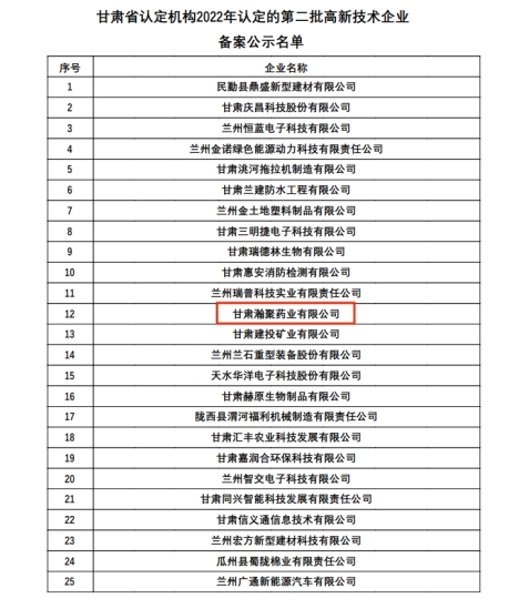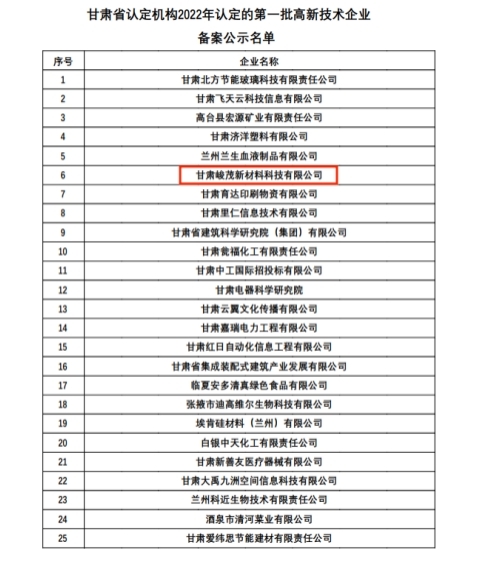 10月18日,科技部火炬中心發(fā)布了“關于對甘肅省認定機構(gòu)2022年認定的第一批、第二批高新技術企業(yè)進行備案公示的通知”,其中專精特新化工產(chǎn)業(yè)孵化器內(nèi)的甘肅峻茂新材料科技有限公司和甘肅瀚聚藥業(yè)有限公司2家入駐企業(yè)被成功認定為2022年高新技術企業(yè)。